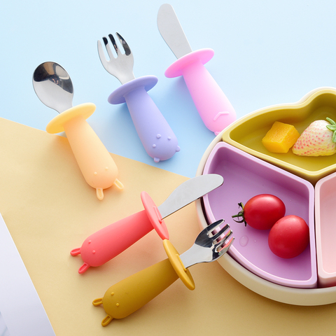ช้อนส้อมสแตนเลสมีมือจับซิลิโคนสำหรับเด็ก,ช้อนส้อมสำหรับเด็กวัยหัดเดินอาหารเด็กรูปทรงสัตว์น่ารักทานอาหาร